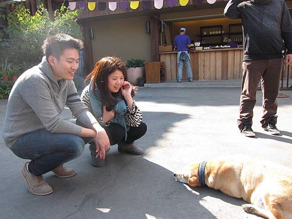 兩個人好奇地看著慵懶躺在地上的狗狗:D